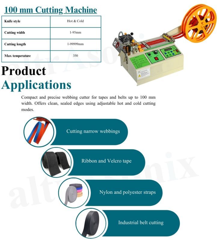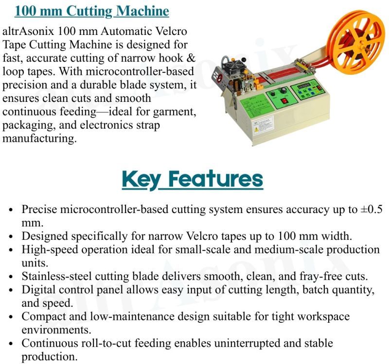 altrAsonix 200 mm Automatic Velcro Tape Cutting Machine is built for medium-to-large-scale industrial operations. It provides precise Hot & Cold cutting for Velcro, industrial straps, reflective tapes, and woven materials. The robust motor and wide feeding platform ensure vibration-free cutting, long operational life, and consistent output—ideal for production where accuracy and durability are essential.